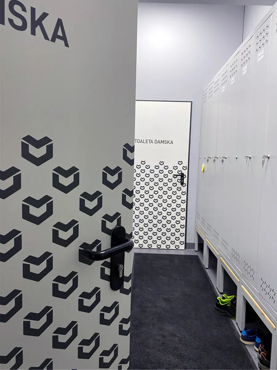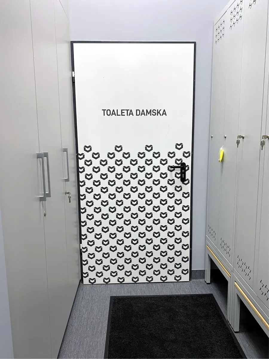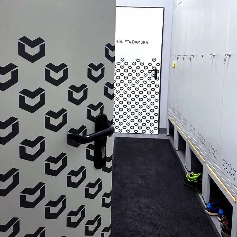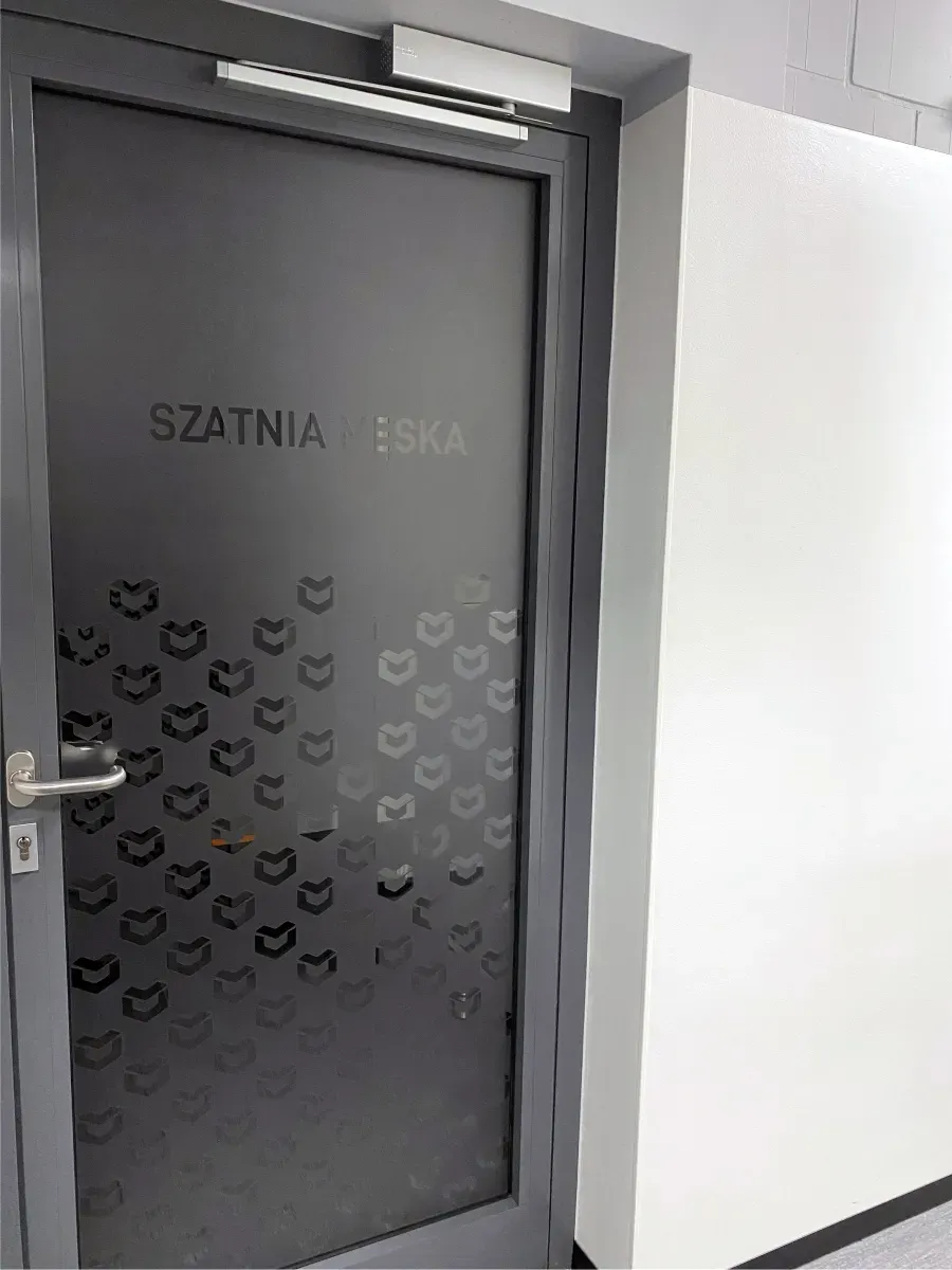 Projekt został wykonany z dbałością o spójność wizualną z identyfikacją marki – wzór oparty został na sygnecie Metalvit, powielonym rytmicznie na taflach szkła i drzwiach.