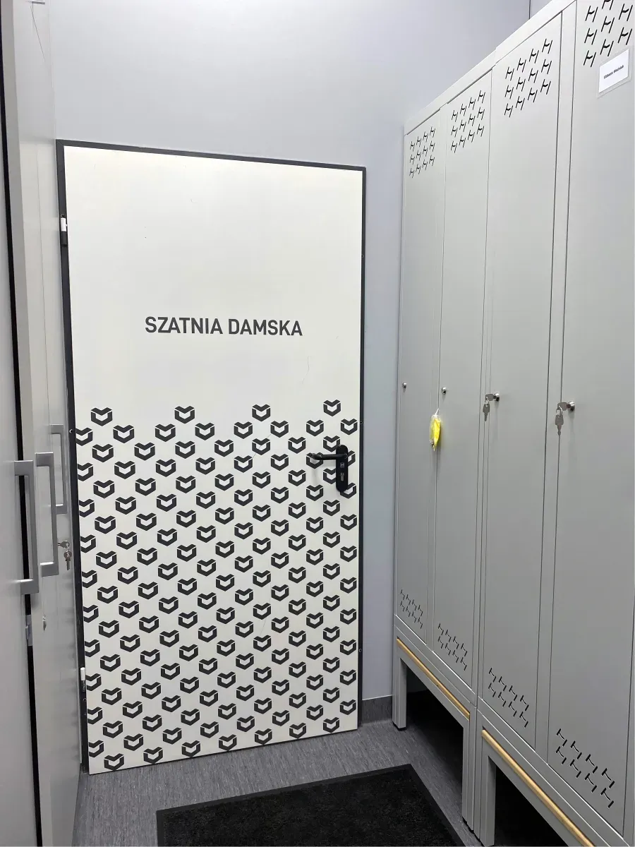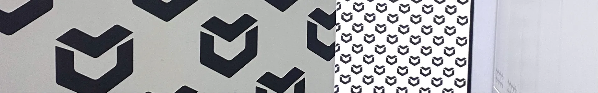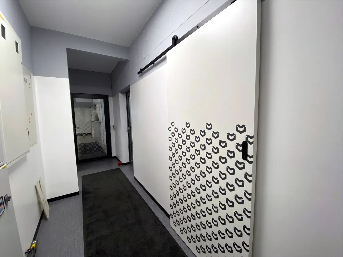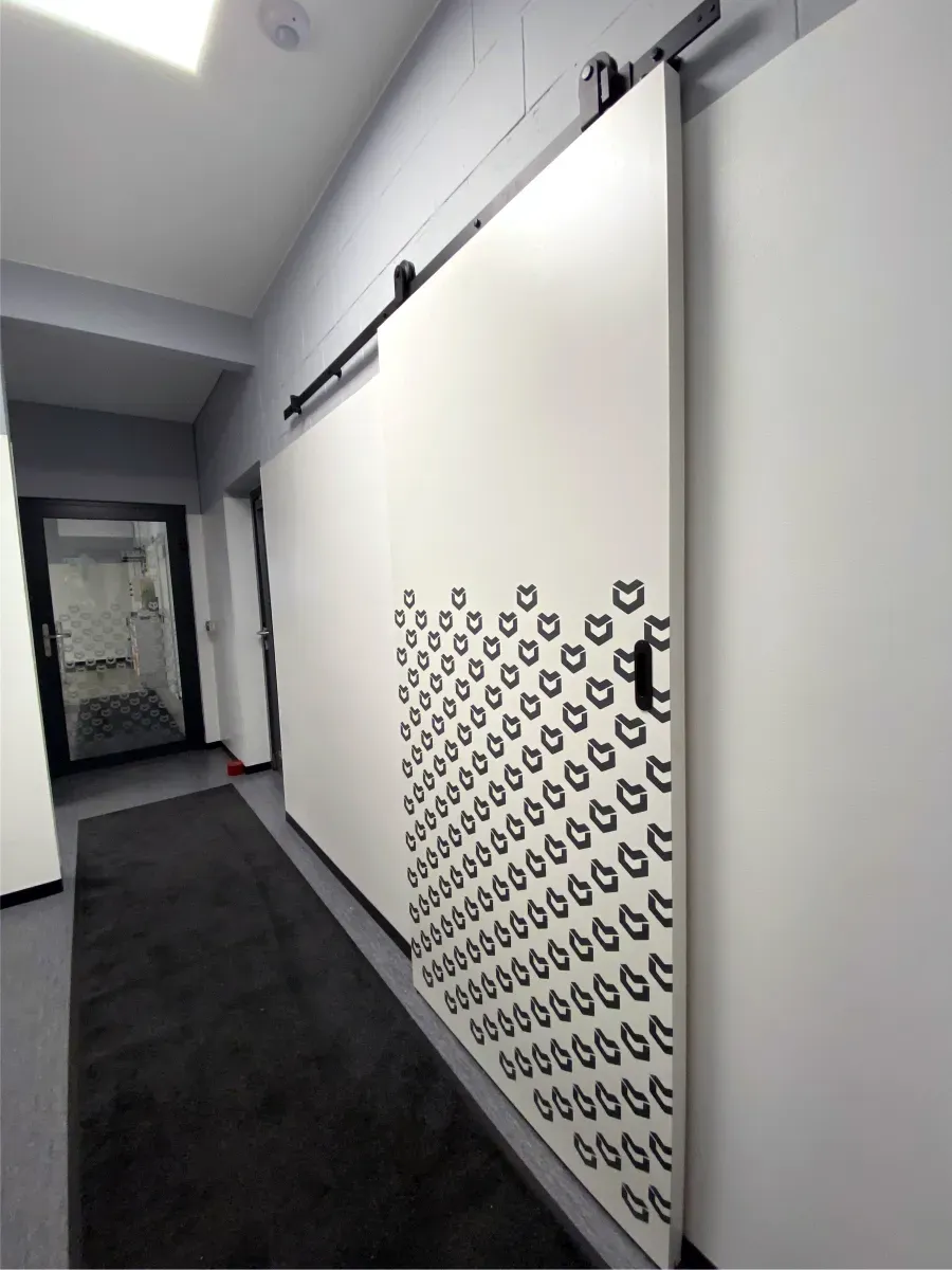 Projekt został wykonany z dbałością o spójność wizualną z identyfikacją marki – wzór oparty został na sygnecie Metalvit, powielonym rytmicznie na taflach szkła i drzwiach.