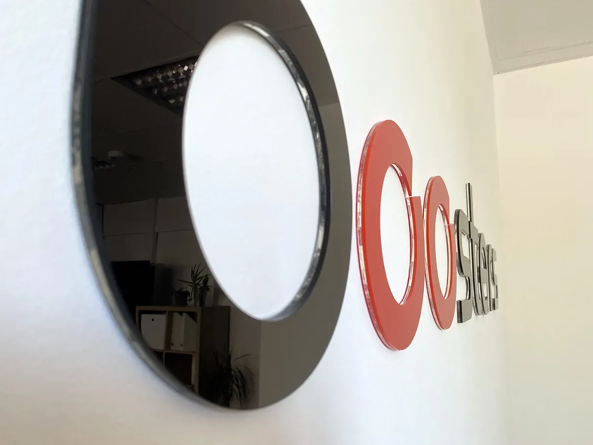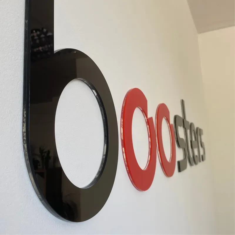 Połączenie błyszczącej czarnej i intensywnej czerwonej pleksi doskonale oddaje nowoczesny, dynamiczny charakter marki, a precyzyjne wykonanie detali podkreśla profesjonalizm i estetykę realizacji. Efekt końcowy to czysty, minimalistyczny logotyp przestrzenny, który przyciąga uwagę i idealnie komponuje się z wnętrzem biura.