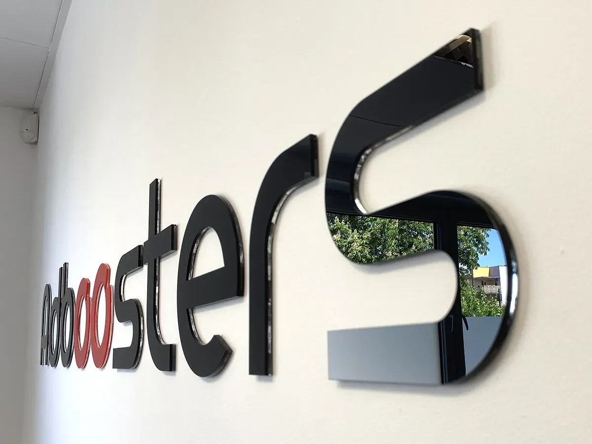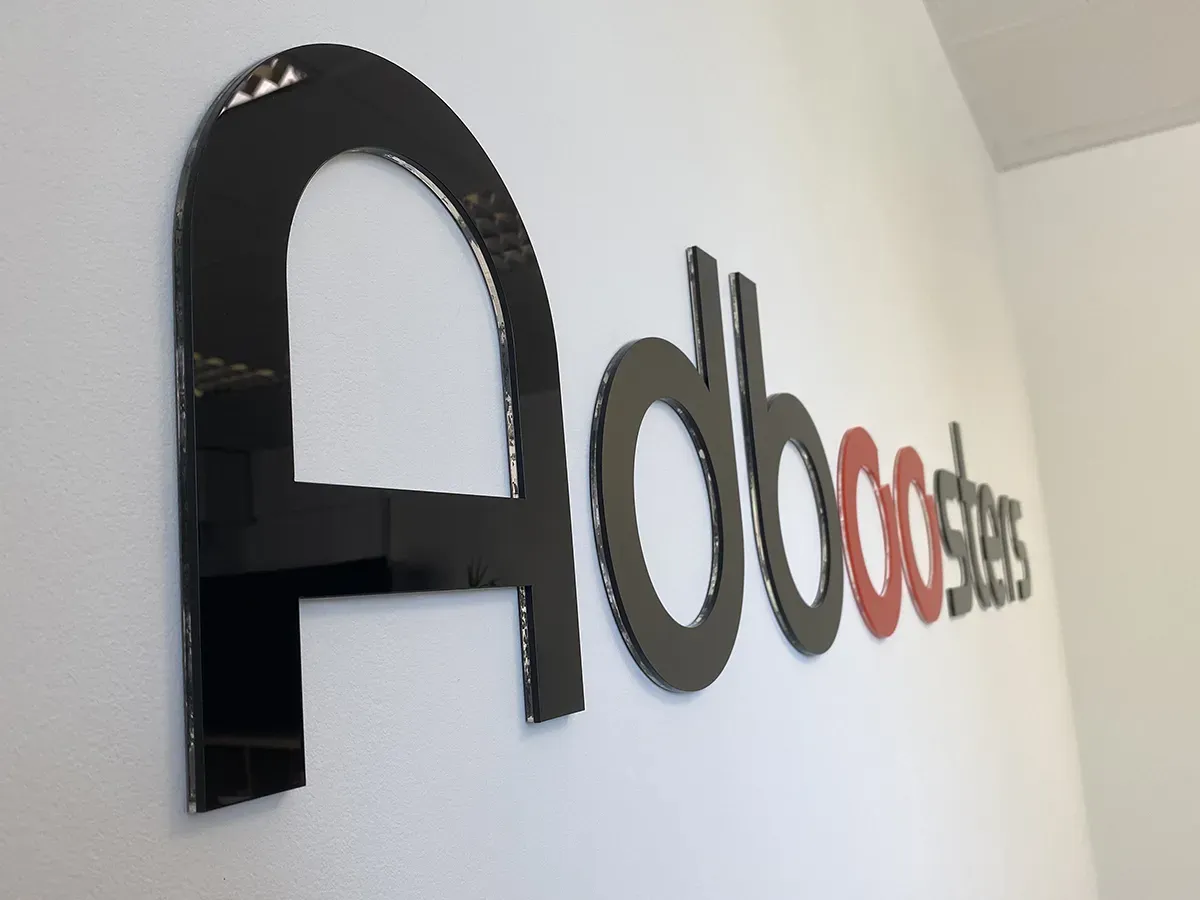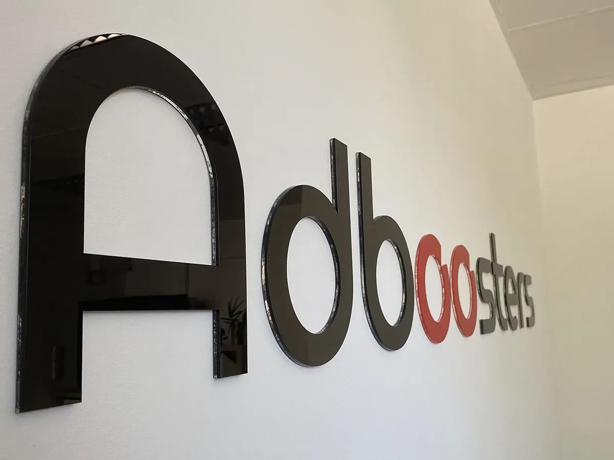 Dla Agencji Marketingowej Adboosters z Bydgoszczy wykonaliśmy logotyp przestrzenny z pleksi w kolorach firmowych – czarnym i czerwonym. Elementy zostały zamontowane na dystansach z bezbarwnej pleksi, co nadało całości lekkości i eleganckiego efektu zawieszenia nad powierzchnią ściany.