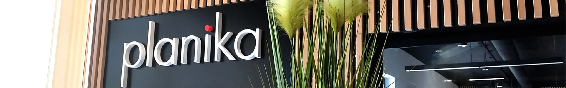 Realizacja logotypów przestrzennych dla marki Planika, wykonana z połączenia pleksi i styroduru, idealnie wpisuje się w elegancką, nowoczesną aranżację wnętrza biura.