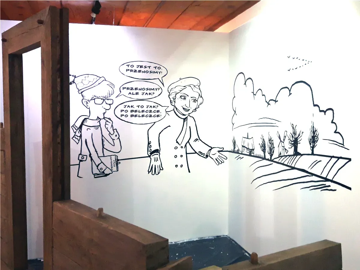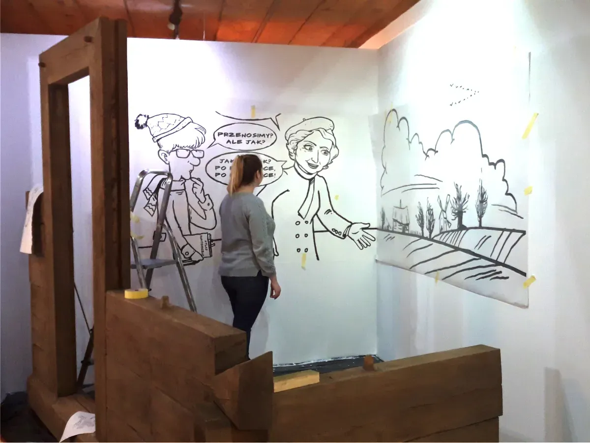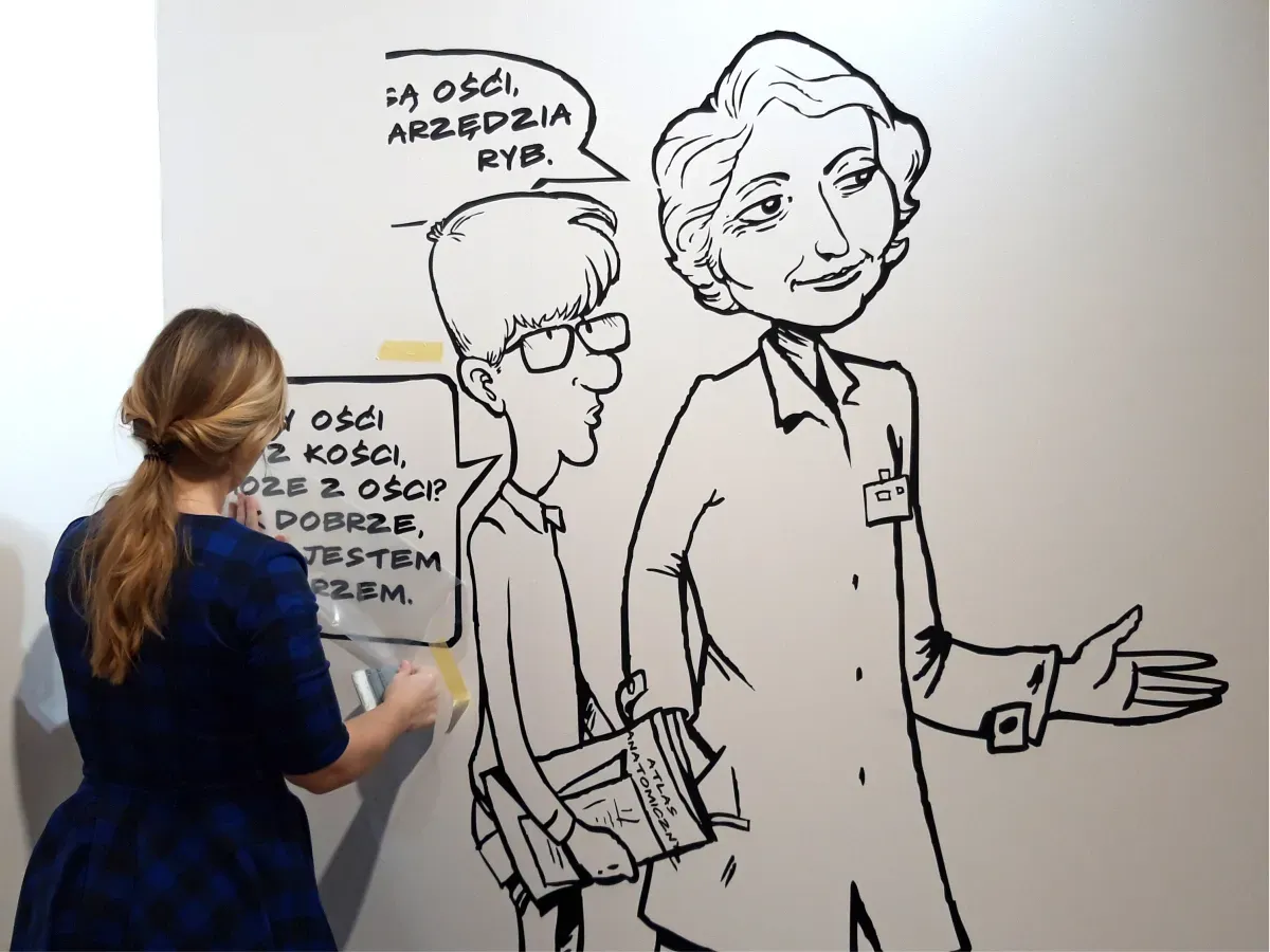 W toruńskim muzeum zrealizowaliśmy wielkoformatowe ilustracje i napisy ścienne wpisujące się w narrację wystaw edukacyjnych. Realizacja obejmowała wycięcie i montaż elementów komiksowych i rysunkowych.