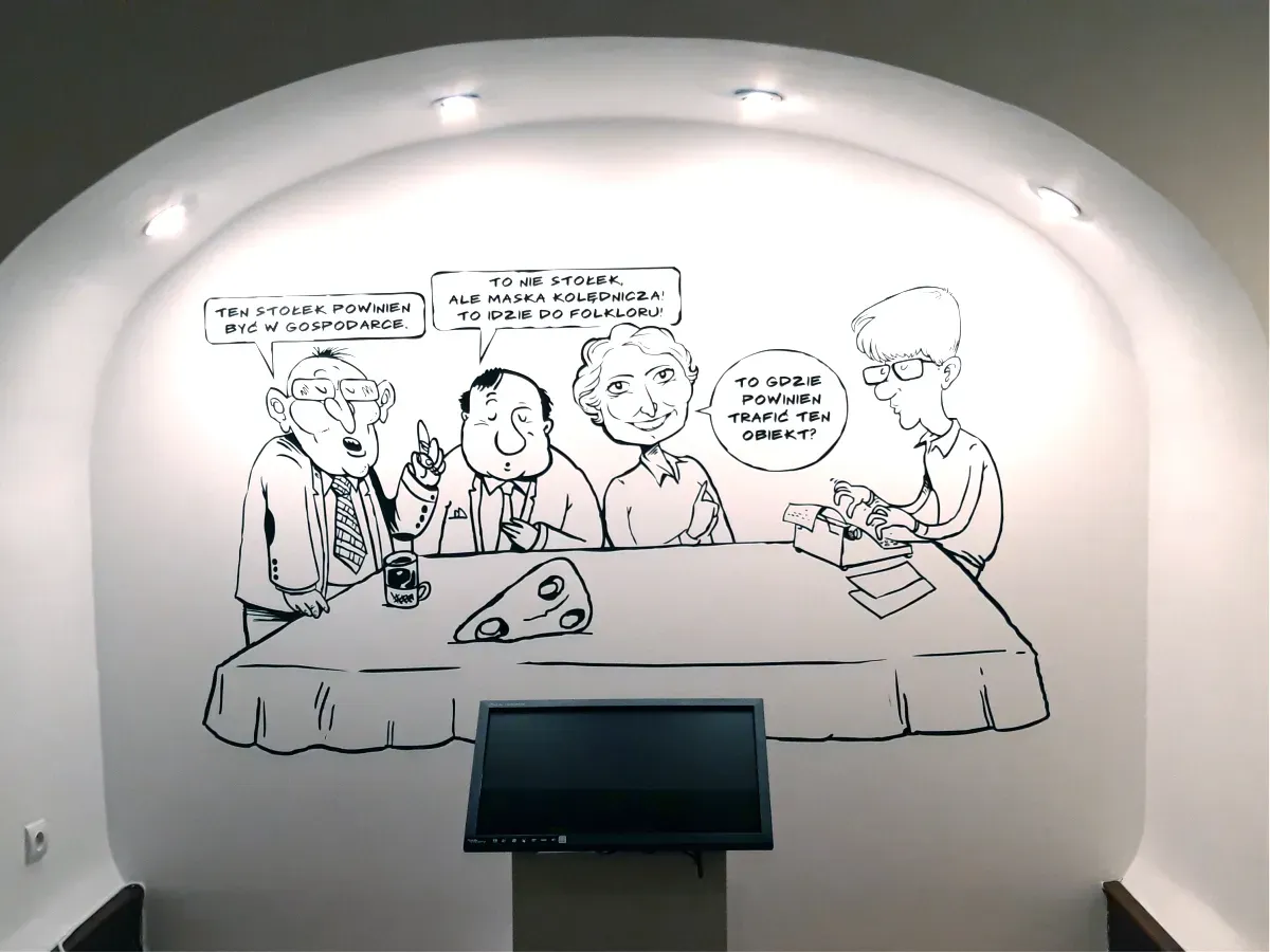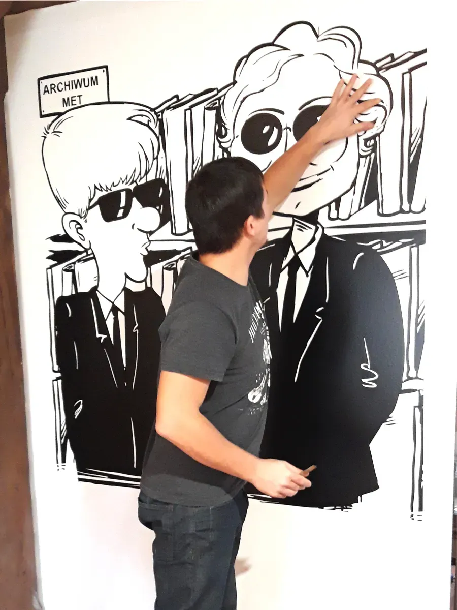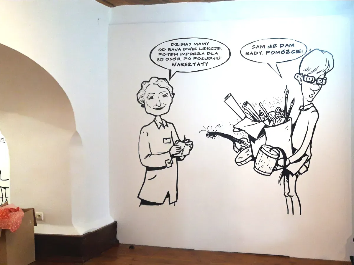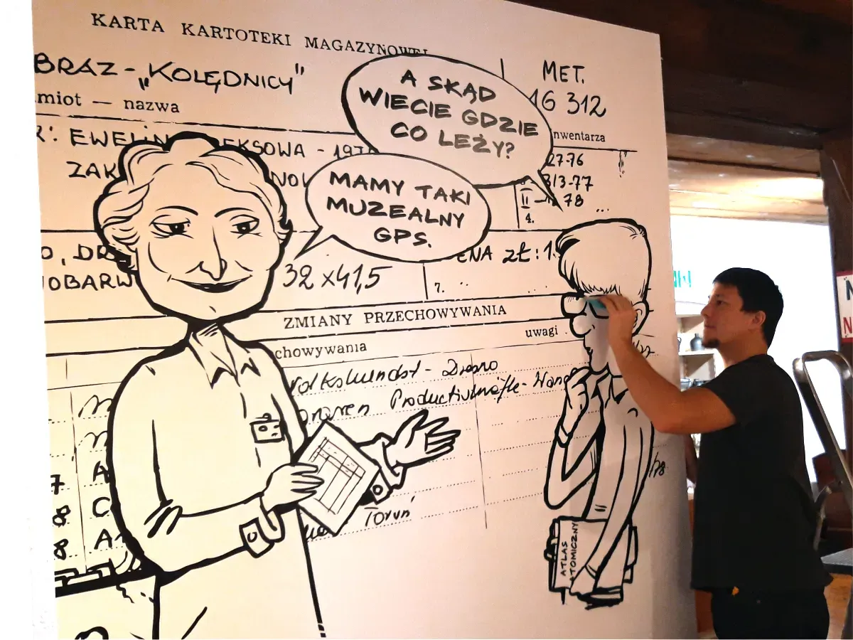 W toruńskim muzeum zrealizowaliśmy wielkoformatowe ilustracje i napisy ścienne wpisujące się w narrację wystaw edukacyjnych. Realizacja obejmowała wycięcie i montaż elementów komiksowych i rysunkowych.