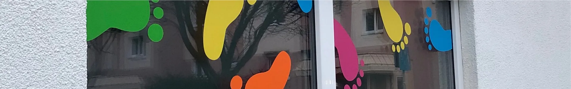 Dodatkowo okleiliśmy witryny przy wejściu, łącząc folię szronioną (dla zapewnienia prywatności i estetyki) z kolorową folią monomeryczną przedstawiającą motyw dziecięcych stópek – element charakterystyczny identyfikacji wizualnej marki MUNGO.